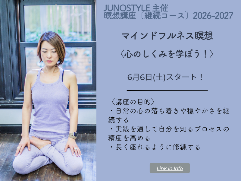 ◆参加資格:Junostyle瞑想講座〈入門コース〉の全10回を受講済の方、True Nature Meditation入門講座(またはそれに準ずる講座)を修了済みの方。ご不明な方はお気軽にご相談ください。
